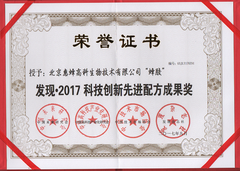 繼田蜜佳人®利達蜂膠軟膠囊(國食健字G20130538)作為中國中醫(yī)科學(xué)院中醫(yī)藥科技合作中心及中國中醫(yī)科學(xué)院養(yǎng)生保健研究中心《蜂膠類保健食品專業(yè)推廣認證產(chǎn)品證書》之后,再次獲得第十四屆中國科學(xué)家論壇《發(fā)現(xiàn)·2017科技創(chuàng)新先進配方成果獎》。